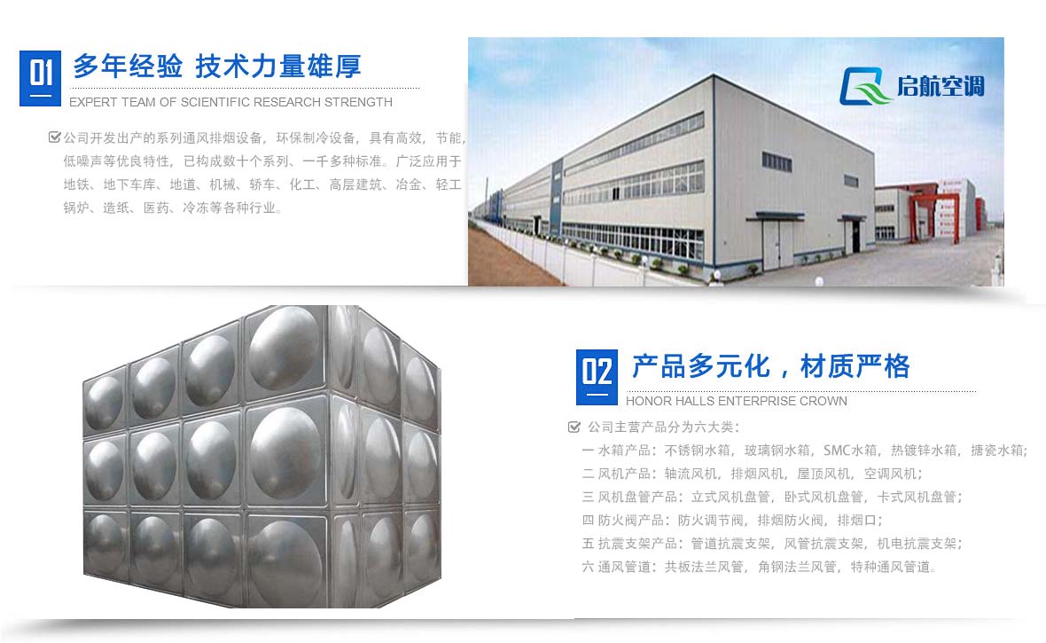 德州啟航空調(diào)設(shè)備有限公司始建于1998年,地處風(fēng)光秀麗的魯西北平原,京杭大運(yùn)河畔,是集設(shè)計(jì)、生產(chǎn)、開(kāi)發(fā)于一體的專業(yè)化生產(chǎn)公司。公司投資引進(jìn)國(guó)內(nèi)先進(jìn)的雙動(dòng)拉伸液壓機(jī)、剪板,沖床鋁合金成套設(shè)備,配合高精密的數(shù)控拉伸成型、模壓成型組合不銹鋼焊接式、法蘭連接式水箱、搪瓷水箱并且擁有模壓風(fēng)機(jī)成套設(shè)備。另外還生產(chǎn)各種規(guī)格的軸流、斜流分機(jī)及各種規(guī)格的SMG水箱,各種防火閥、鋁合金風(fēng)口、散流器等。